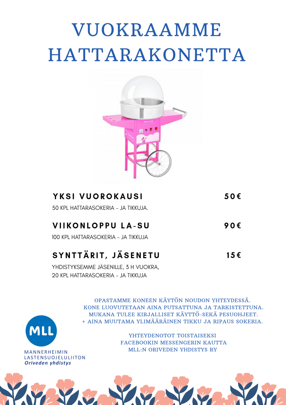 Yhdistyksemme kautta on mahdollista vuokrata hattarakonetta vaikkapa synttäreille tai kesäjuhliin.